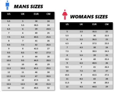 women US5.5=EU36=22.5cm, women US6=EU36.5=23cm, women US6.5=EU37.5=23.5cm, women US7=EU38=24cm, women US7.5=EU38.5=24.5cm, women US8=EU39=25cm, women US8.5=EU40=25.5cm, women US9=EU40.5=26cm, women US9.5=EU41=26cm, men US6=EU38.5=24cm, men US6.5=EU39=24.5cm, men US7=EU40=25cm, men US7.5=EU40.5=25.5cm, men US8=EU41=26cm, men US8.5=EU42=26.5cm, men US9=EU42.5=27cm, men US9.5=EU43=27.5cm, men US10=EU44=28cm, men US10.5=EU44.5=28.5cm, men US11=EU45=29cm, men US11.5=EU45.5=29.5cm, men US12=EU46=30cm